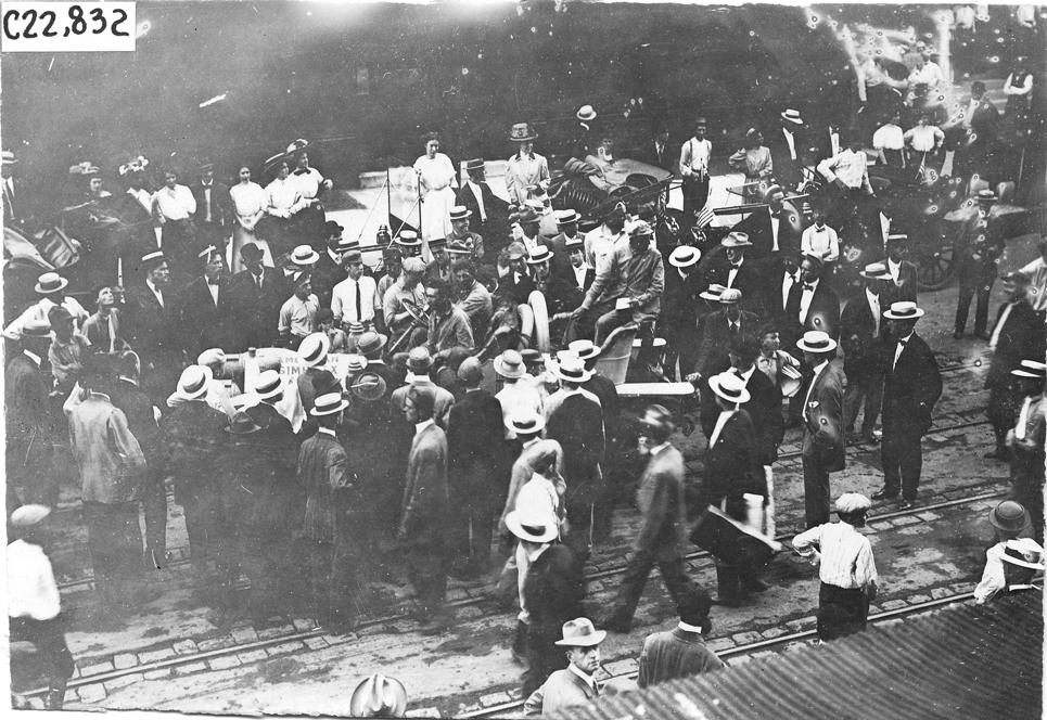 Large crowd surrounds Glidden tourist vehicles at Kansas City, Missouri, at 1909 Glidden Tour