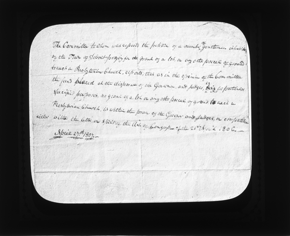 Letter to the committee who petitioned for a land grant for a Presbyterian church in Detroit, stating that is in not in the power of the governor or judges to grant the petition. Recorded in lantern slide ledger: "D/Churches-Presb., document rejecting petition for land."