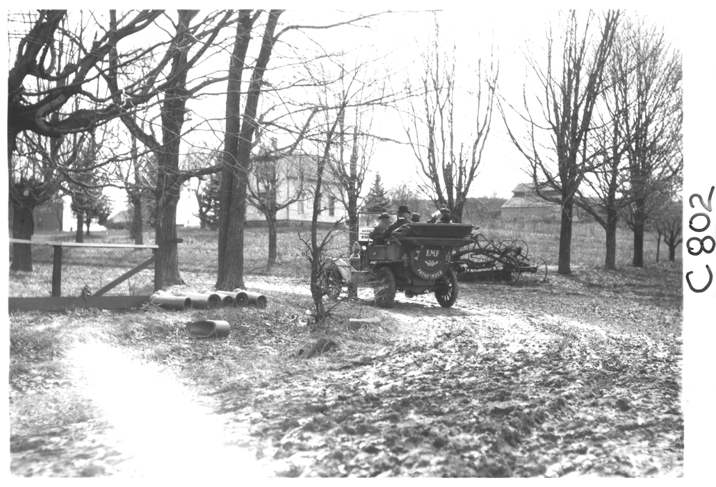 View of Dai Lewis and party in E-M-F car, on muddy rural road, on pathfinding tour for the 1909 Glidden Tour.