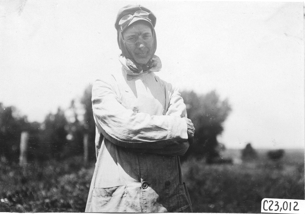 Glidden tourist posed with arms folded across chest, at 1909 Glidden Tour