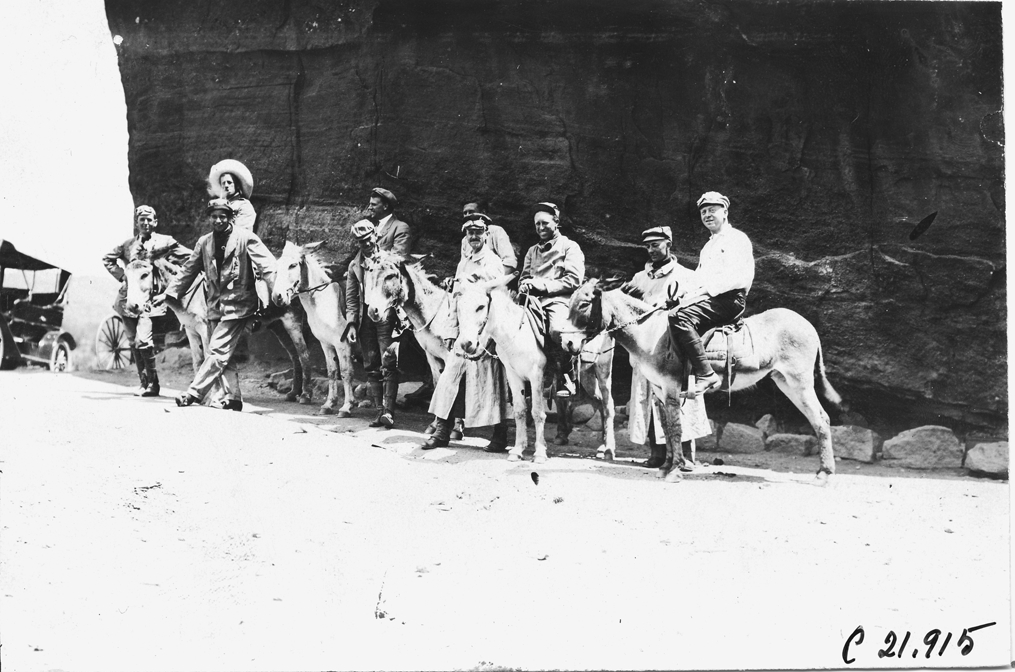 Glidden tourists on donkeys in the Garden of the Gods, Colorado, at the 1909 Glidden Tour