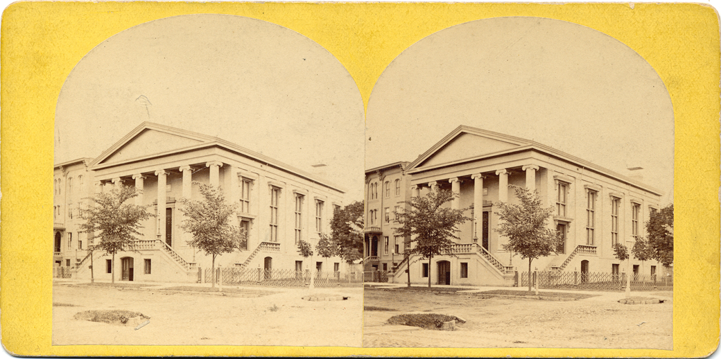 Gold mount. View of First Unitarian Church. Handwritten on stereocard back: "Cor. Lafayette & Shelby, n.w., 1853, 1880.