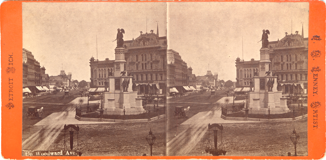 Orange mount. View up Woodward Avenue including the Soldiers' and Sailors' Monument. Printed on front of stereocard: "Up Woodward Ave., Detroit, Mich., J.A. Jenney, artist."
