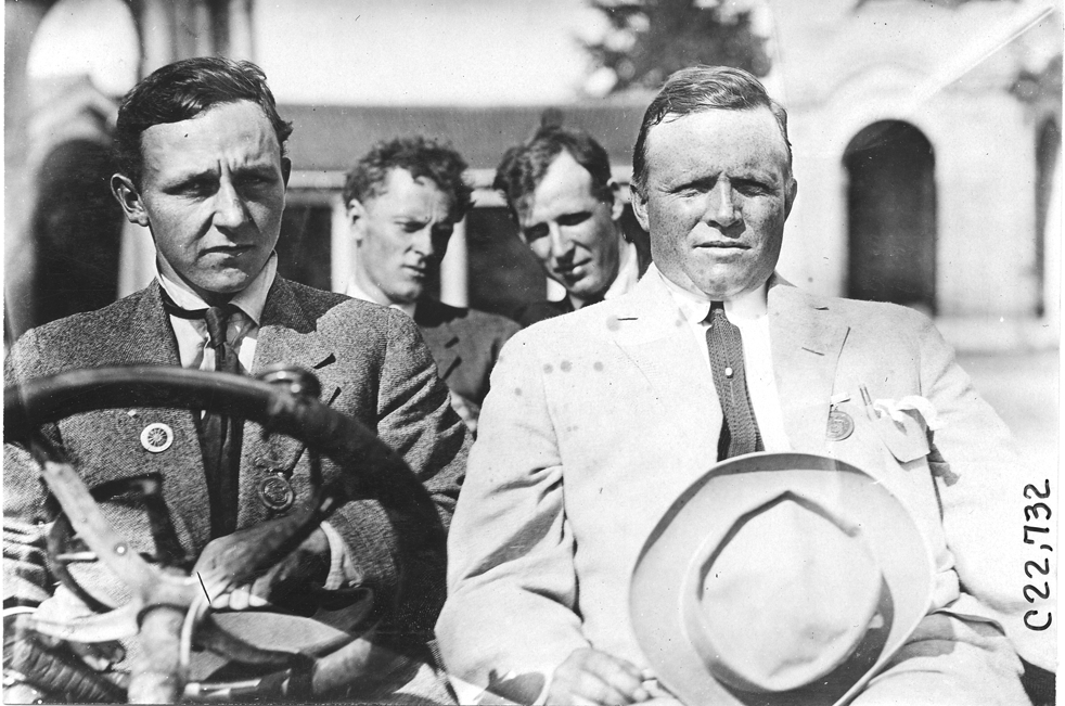 Jean Bemb and crew in Chalmers car in Kansas City, Missouri, at 1909 Glidden Tour