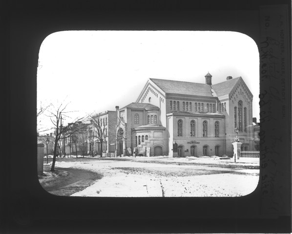 View of the First Baptist Church and other buildings on a snowy street. Recorded in lantern slide ledger: "D/Churches-Baptist-First."