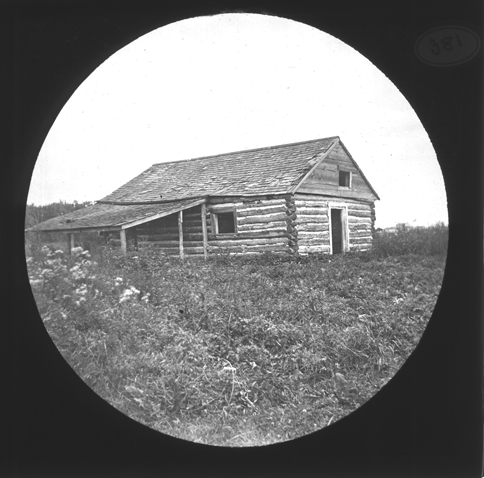 View of a log cabin in a field. Lantern slide mount has a round opening. Recorded in lantern slide ledger: "D/Log houses."