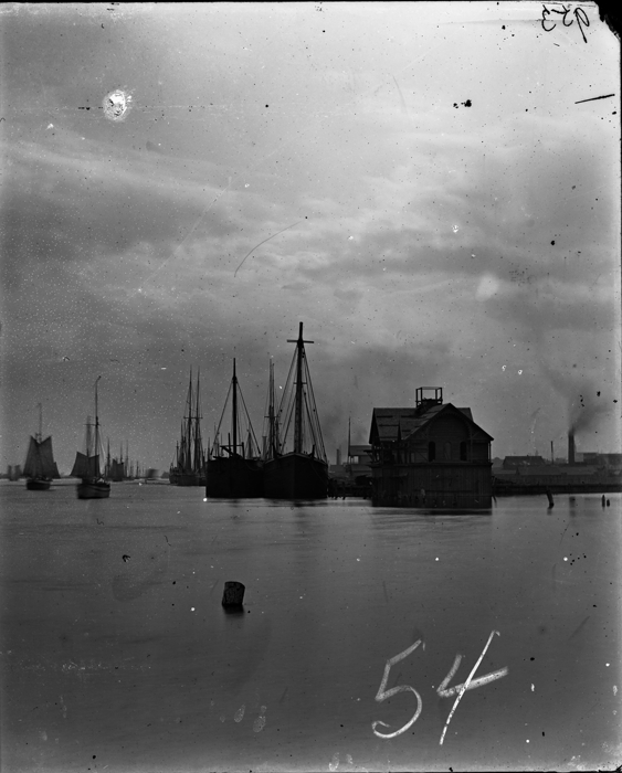 View of sailing cargo ships docked near the Detroit Boat Club. Other boats are farther out in the Detroit River. Batten-and-board clubhouse veranda is just visible beyond building in disrepair. Recorded in glass negative ledger: "LD/Organizations-Detroit boat club."