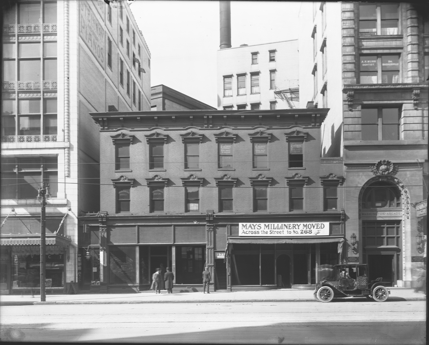 Washington Arcade Building, next door a building with sign "Mays Millinery Moved Across the Street to 268," a vehicle parked in front, and a group of men standing in front. Recorded in glass negative ledger: "D/Streets-Woodward."