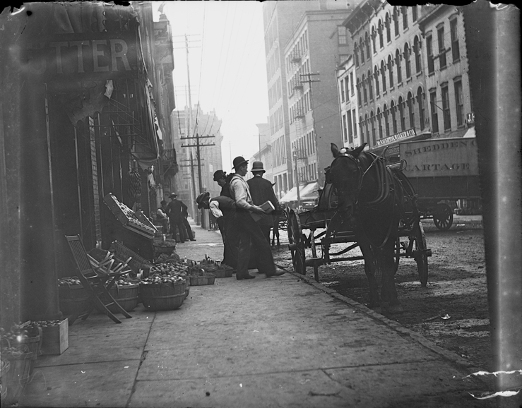 Men in front of fruit and vegetable stand loading boxes onto horse-drawn wagon, one man peering at produce. Recorded in glass negative ledger: "LD/Streets-Woodbridge (West)."