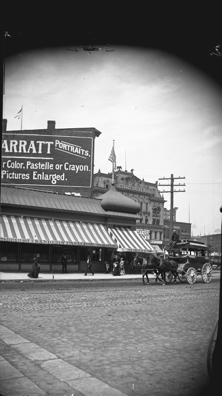 View of Sanders Pavilion on Michigan Avenue, with the Detroit Opera House in background and horse-drawn vehicle and pedestrians on street. Recorded in glass negative ledger: "LD/Industries & bus. houses-Sanders, Fred."