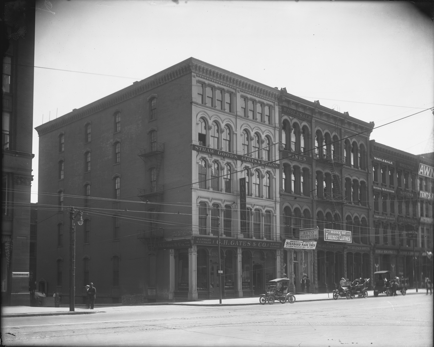 Businesses located on Jefferson and Bates include G. H. Gates & Co. wholesale hats, an auto supply store, and Schloss Bros. wholesale clothing. Several cars parked on street. Recorded in glass negative ledger: "D/Streets-Jefferson & Bates."