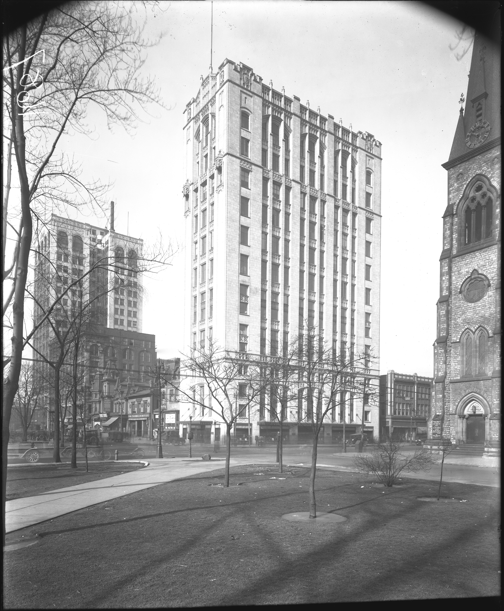 Fyfe Building viewed from northeast corner of Grand Circus Park. View includes the Kales Building, a theater, Ross Furs, a sign that reads Brede and Schroeter. Across the street from Fyfe Building a corner of the Central Methodist Episcopal Church is visible. Recorded in glass negative ledger: "LD/Buildings-Fyfe's."