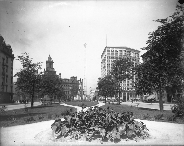 View of small flower garden in foreground at Campus Martius with City Hall and Soldiers' and Sailors' Monument in background. Recorded in glass negative ledger: "D/Streets-Campus Martius."
