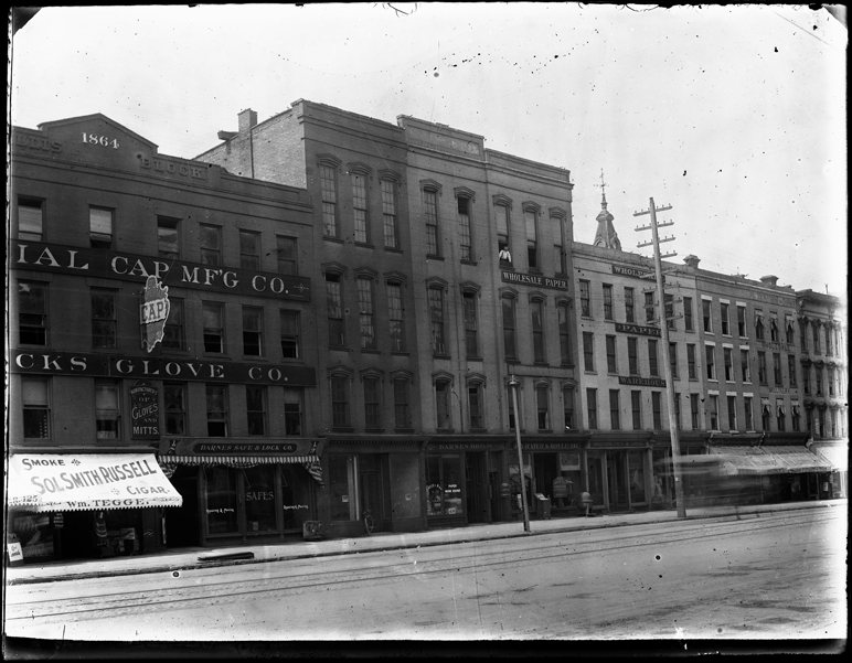 View of commercial buildings and storefronts on Jefferson Avenue. Businesses include Imperial Cap Manufacturing Co., Barnes Safe & Lock Co. and Hatch and Boyle. Recorded in glass negative ledger: "D/Streets-Jefferson."