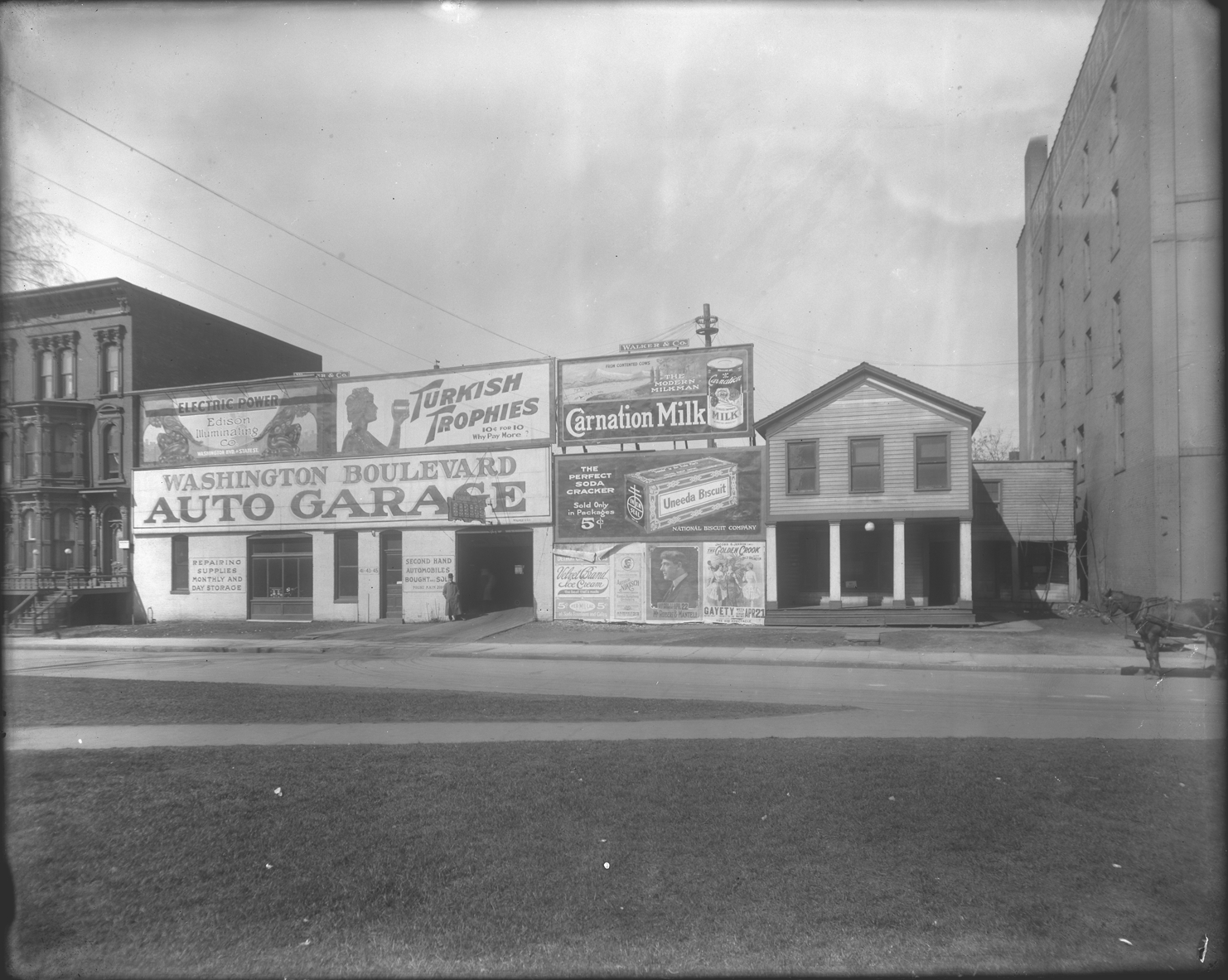 Washington Boulevard Auto Garage with signs for products around shop and businesses on both sides, with view of street. Building was formerly Scottish Presbyterian Church and First Christian Church. Recorded in glass negative ledger: "D/Churches-Presb.-Scotch (Central)."
