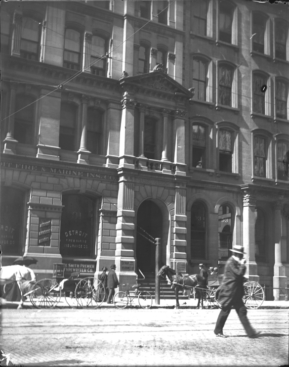 Buhl Block on Griswold with businesses such as Detroit Fire & Marine Insurance Co. and Detroit Savings Bank, with a view of the street. Recorded in glass negative ledger: "LD/Buildings-Buhl."