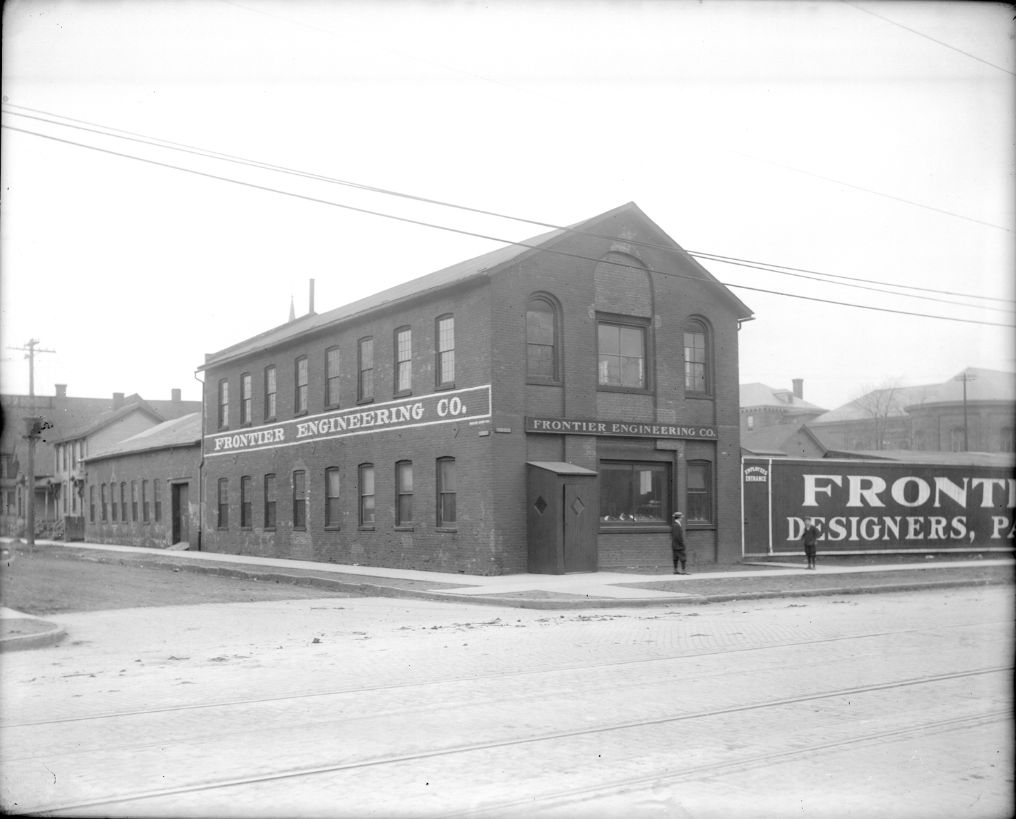 Frontier Engineering Co. on Fort Street, man and boy standing outside. Recorded in glass negative ledger: "D/Streets-Fort; also LD/Industries & business houses-Frontier engineering co."