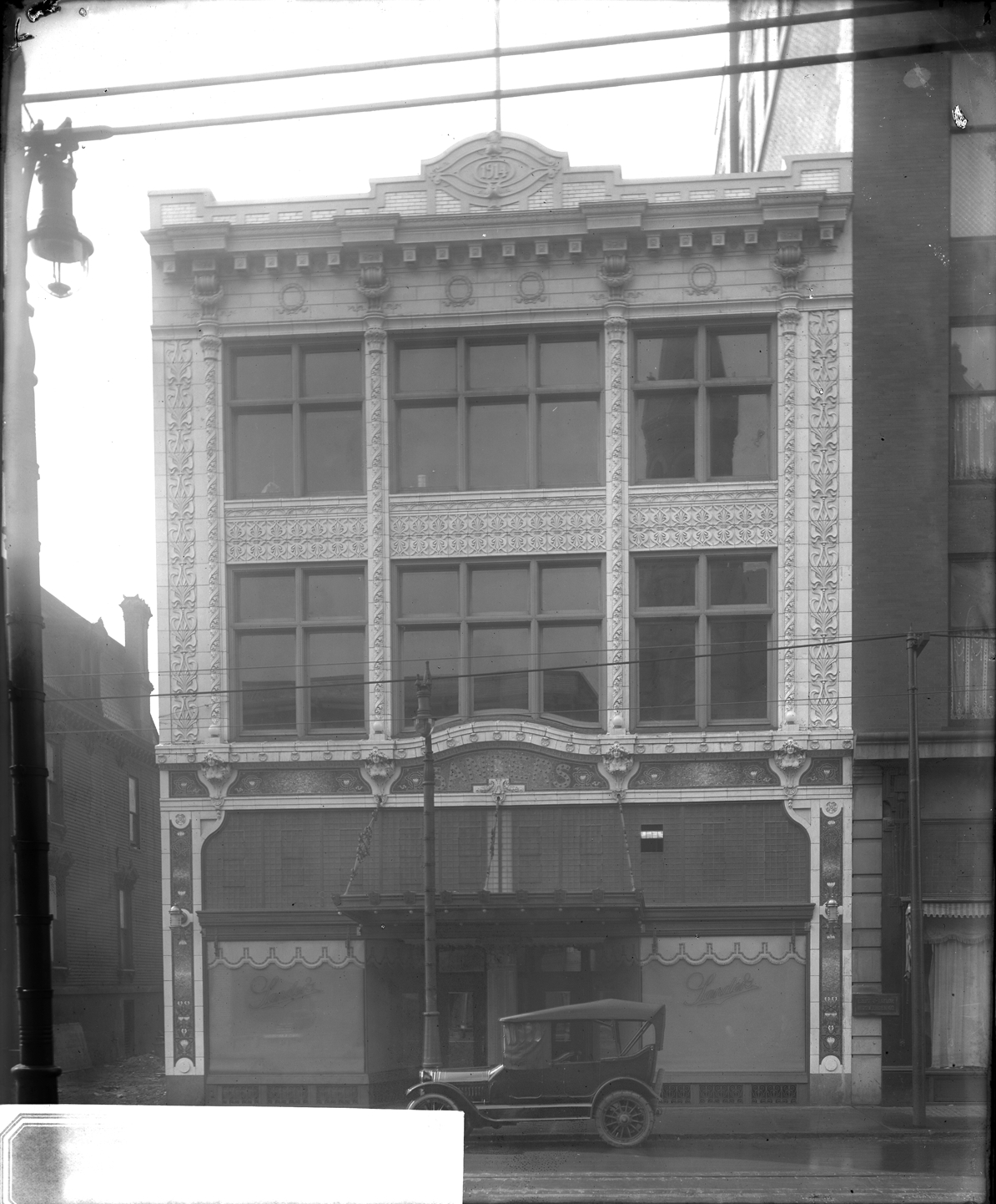View of Sanders confectionery; three-story commercial building with storefront; decorative floral detail on building facade; "Sanders" painted in storefront windows; automobile parked in front. Recorded in glass negative ledger: "D/Industries & business houses-Sanders, Fred."