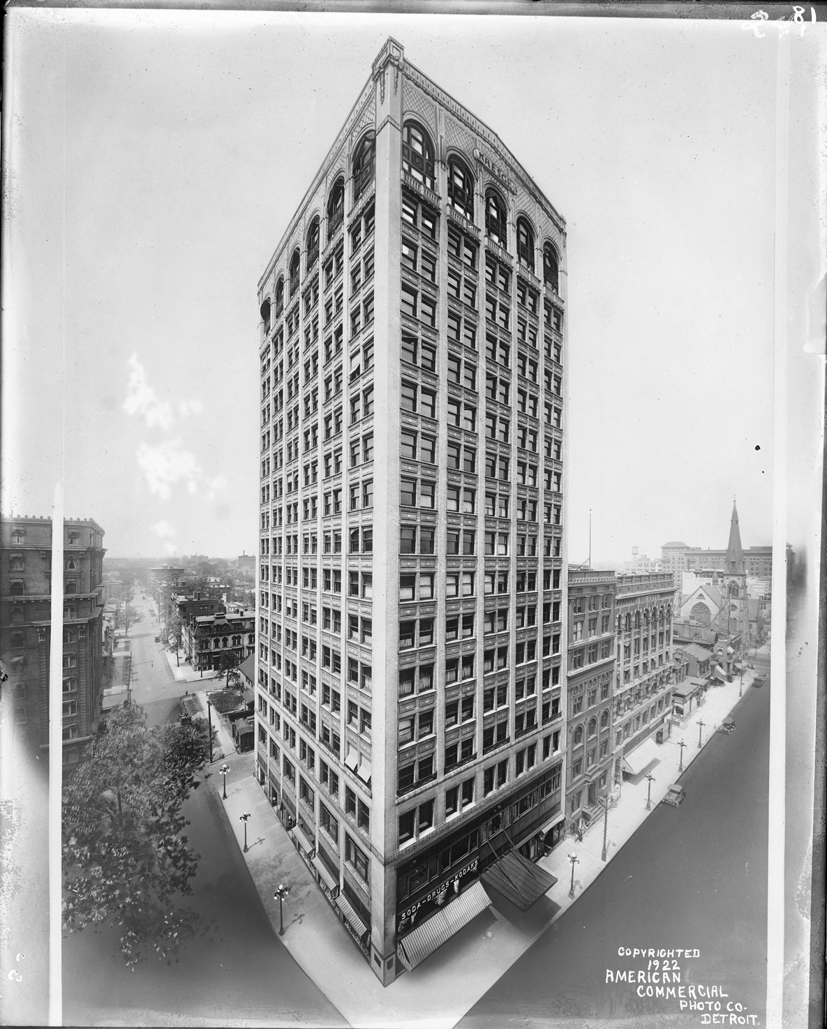 Two sides of the Kresge building at Adams Avenue and Grand Circus Park, with other buildings and a view of the street. Written on front of glass negative, "Copyrighted 1922, American Commercial Photo Co. Detroit." Recorded in glass negative ledger: "D/Industries & business houses-Kresge, S.S. bldg."