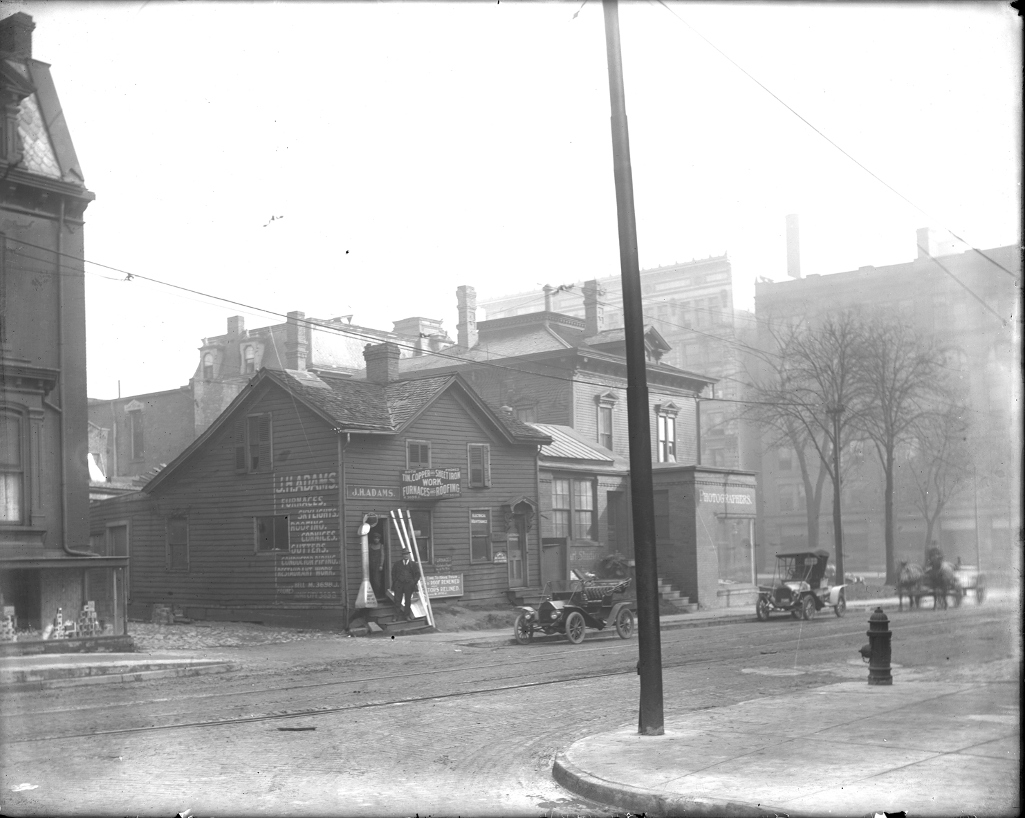 J.H. Adams Tin, Copper & Sheet Iron Work on Clifford Street near corner of Washington Blvd., two men standing in front door of Adams shop, two cars and a horse-drawn wagon on the street, photographers business on the corner. Recorded in glass negative ledger: "D/Streets-Washington & Clifford."