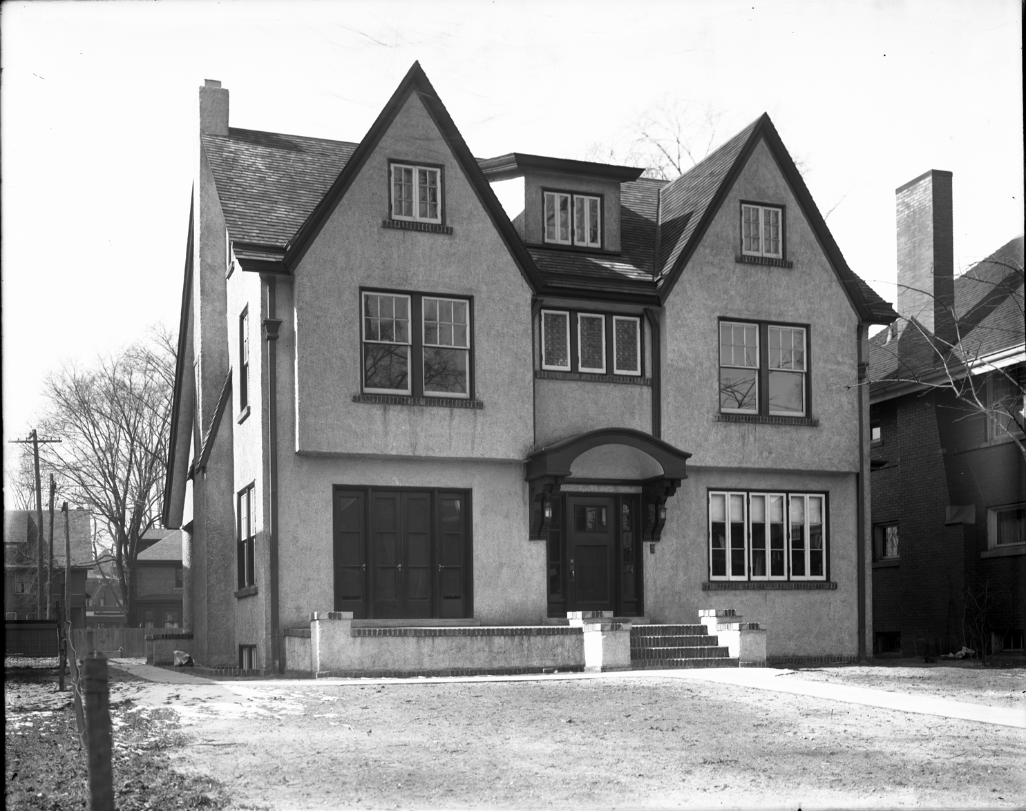 Stucco house with two front gables; brick trim on porch and windowsills. Recorded in glass negative ledger: "D/Historic houses, Hurd, 283."