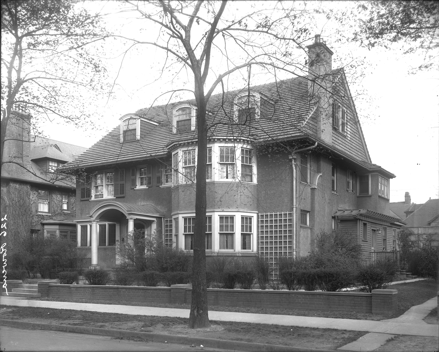View of side-gabled three-story stucco house; columns support rounded arch entry porch roof; dormer windows on roof; bay windows in front of house. Recorded in glass negative ledger: "D/Historic houses-Moross, J.A., 226 Rowena."