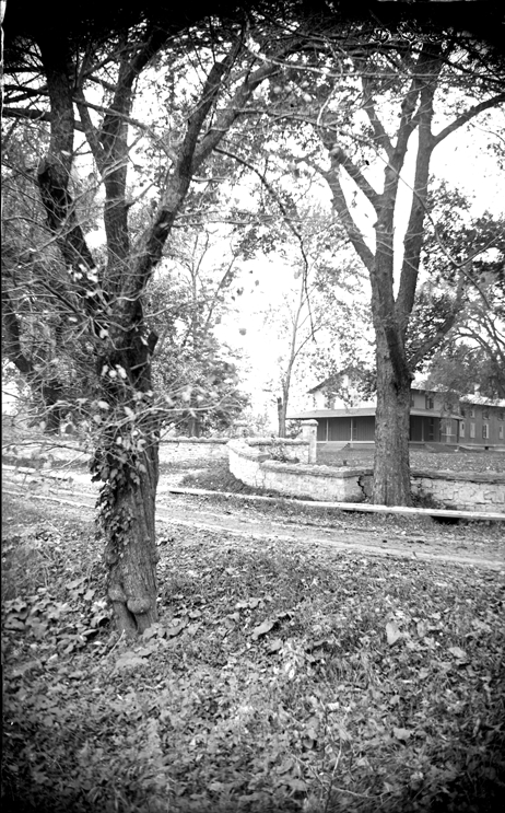 Batten-and-board house with wrap-around porch, set among trees behind low mortared stone wall. Wall is cracking in several places. Recorded in glass negative ledger: "D/River-Islands-Grosse Ile." Image corners rounded.
