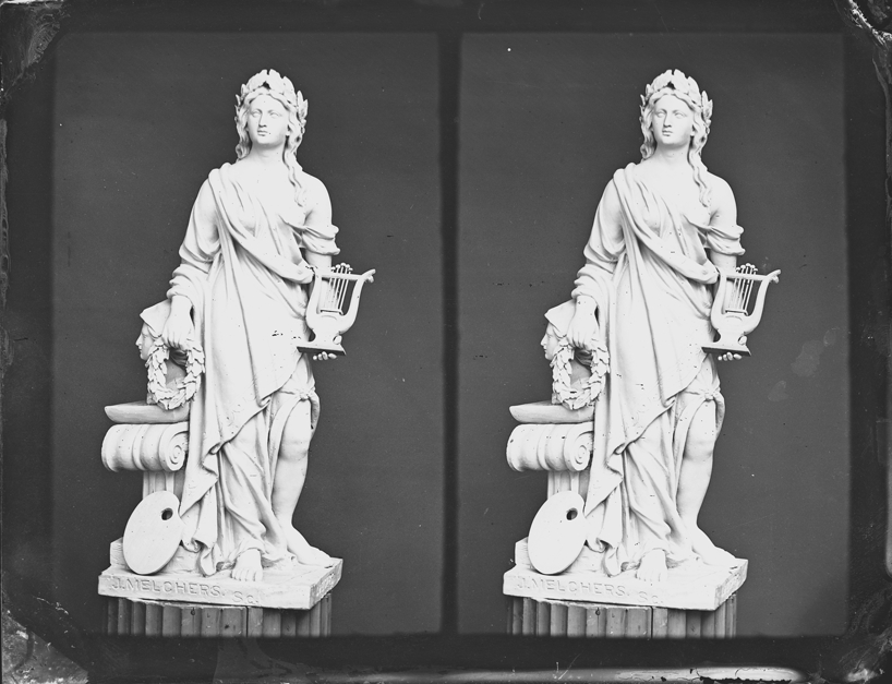 Stereo negative. Allegorical statue of woman wearing laurel wreath and holding another, also holding a lyre. Bust of another woman on short pillar, with artist's palette leaning on base. Engraved on base "J. Melchers. Sc." One of the allegorical sculptures on the 1871 city hall buildings. Recorded in glass negative ledger: "D/Statue." Emulsion badly damaged on edges and corners.