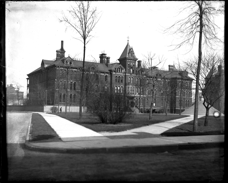 Brick Second Empire hospital building with dormers, square central tower, and metal roofline trim, viewed at an angle across city park. Fountain with winter cover and cement sidewalks in park. Recorded in glass negative ledger: "D/Hospitals-St. Mary's." Emulsion discolored and lifting at edges.
