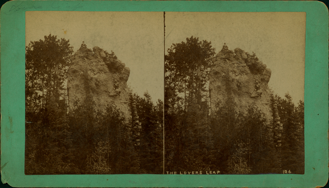 Green mount. A man sits on the top of Lovers' Leap on Mackinac Island, trees are in the foreground. Handwritten on front of stereocard: "126. The Lovers Leap." Printed on stereocard back: "Johnson Photo., Room 423 Rochester Block, Minneapolis, Minn."