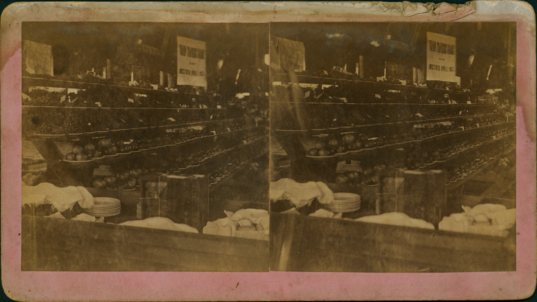 Lavender mount. Interior view of an unidentified produce store, primarily apples and grapes on dishes against one wall of the store. Printed on stereocard back: "McManus Brothers, photographers, Traverse City, Michigan, no. 19." Handwritten on back: "Apples & grapes."