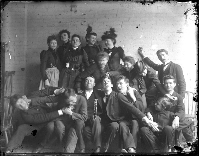 Group of men and women pose in front of brick wall; some make exaggerated facial expressions. Recorded in glass negative ledger: "D/Schools-Detroit School of Fine Arts."