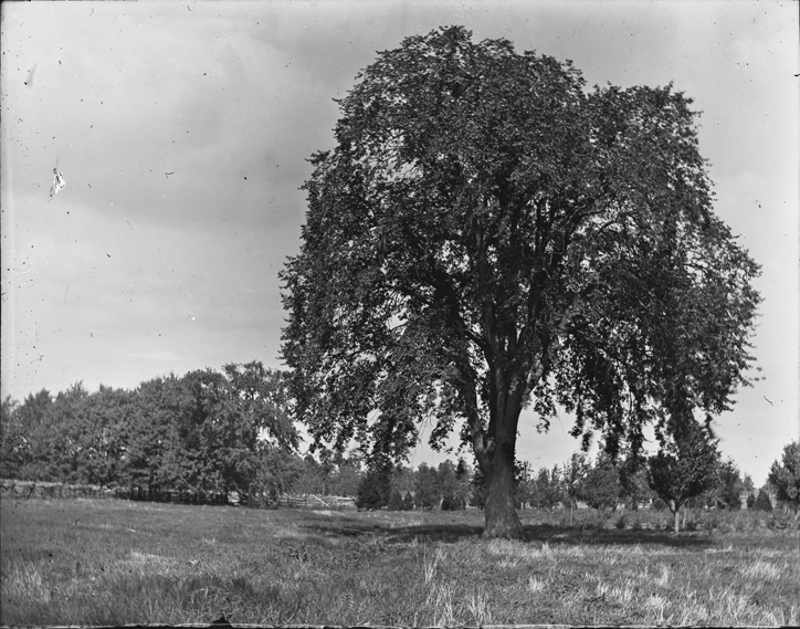 Large tree stands in rural countryside with trees and wooden fencing in background, in Trenton, Michigan. Recorded in glass negative ledger: "M/Localities-Trenton."
