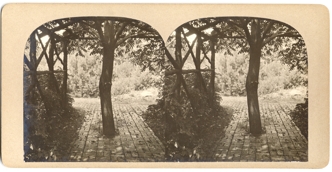 Gray mount. Dome topped. View of garden walk with a tree in the center and wooden trellis around walk, with bushes in background.