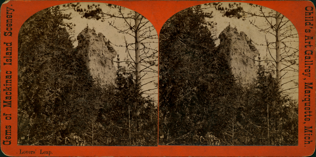 Orange mount. View of Lovers' Leap on Mackinac Island nearly obscured by trees. Printed on front of stereocard: "Gems of Mackinac Island scenery, Lovers' Leap, Child's Art Gallery, Marquette, Mich."