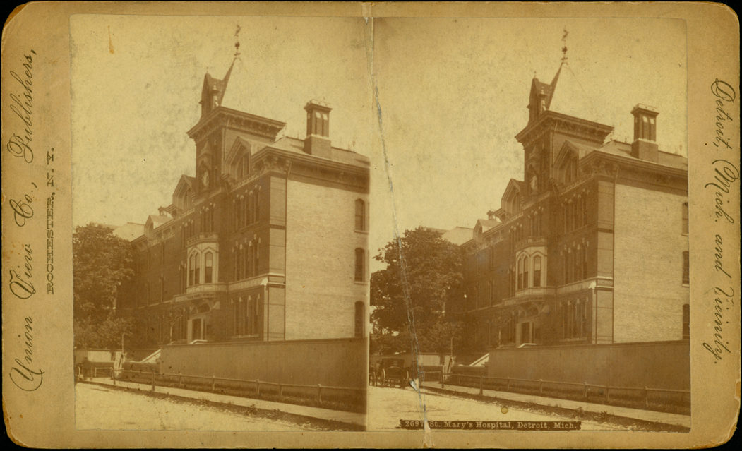 Beige mount. Front and side view of a four-story building surrounded by a fence with carriage in the front. Printed on front: 2697 St. Mary's Hospital, Detroit, Mich., Union View Co., Publishers, Rochester, N.Y., Detroit, Mich. and Vicinity. Stereocard is cracked.