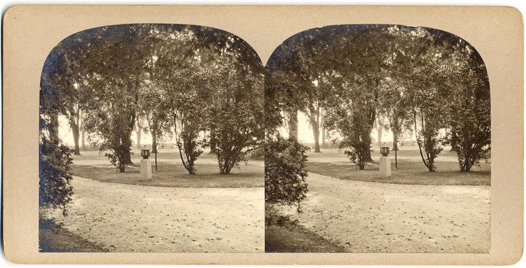 Gray mount. Dome topped. View of a lantern on concrete pedestal with driveway in foreground and trees in background on Newberry estate.