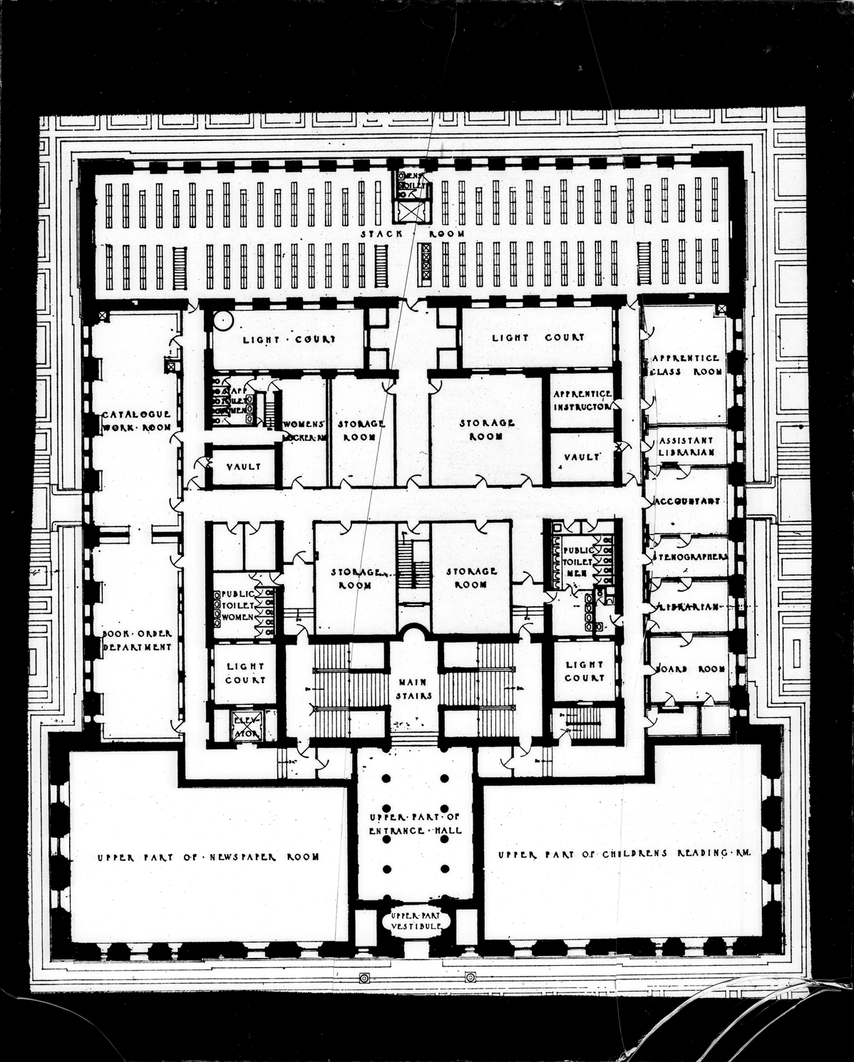 Floor plan for mezzanine of Main Library, Detroit Public Library; plans show catalogue work room, storage rooms, book order department, stairs, restrooms, offices, etc. Recorded in glass negative ledger: "D/Libraries-Detroit Public-Floor plans-Mezz."