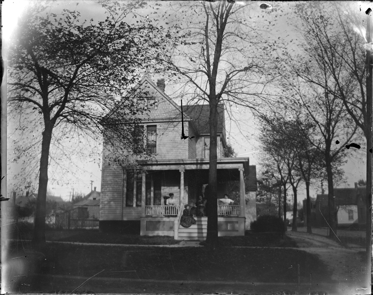 Several women pose on porch of wooden-frame Queen Anne style house on corner. Recorded in glass negative ledger: "D/Streets-Thirteenth, 1084 13th St., corner of Bryant." Negative is scratched.
