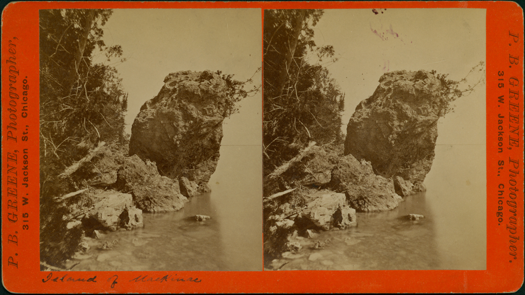 Orange mount. View of Leaning rock on Mackinac Island near the water's edge. Printed on front of stereocard: "P.B. Greene, photographer, 315 W. Jackson St., Chicago." Handwritten on front: "Island of Mackinac." Handwritten on stereocard back: "Leaning rock."