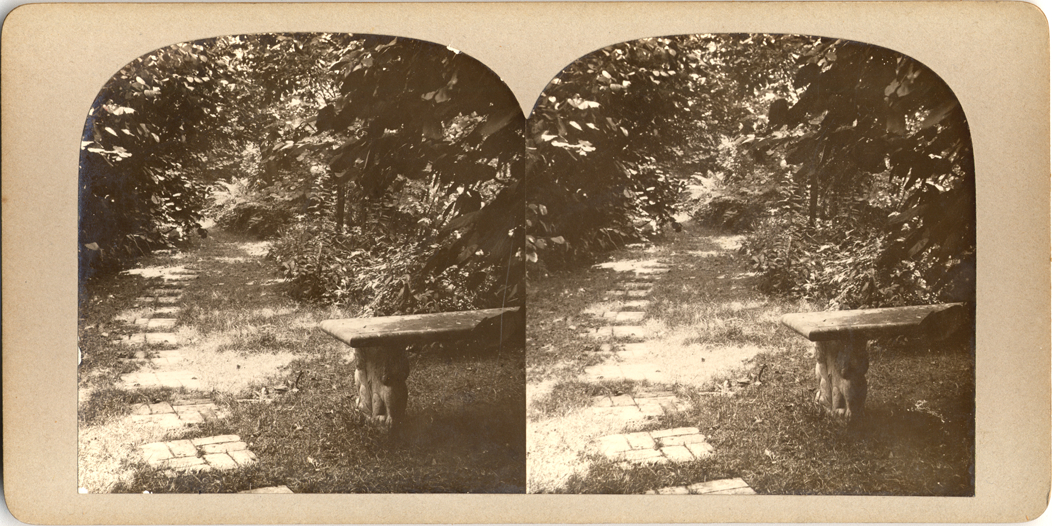 Gray mount. Dome topped. View down garden walk with stone bench on right and trees in background.