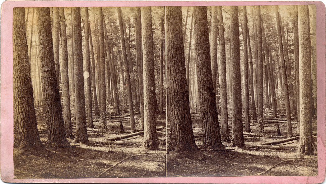 Lavender mount. Grove of trees. Printed on stereocard back: "C.E. Baldwin, Flint, Mich." Handwritten on back: "6."