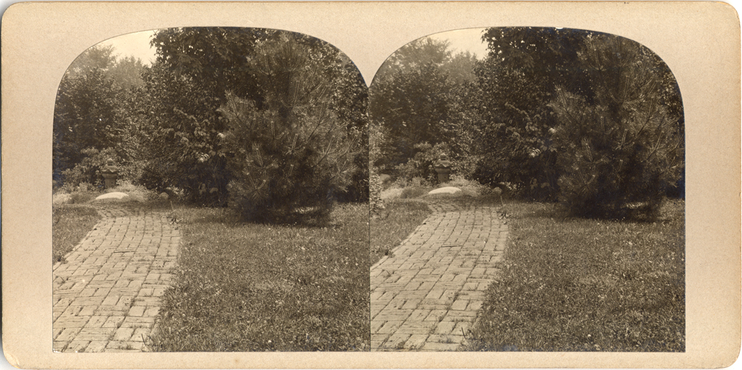Gray mount. Dome topped. View down a garden walk with trees and bushes in background.