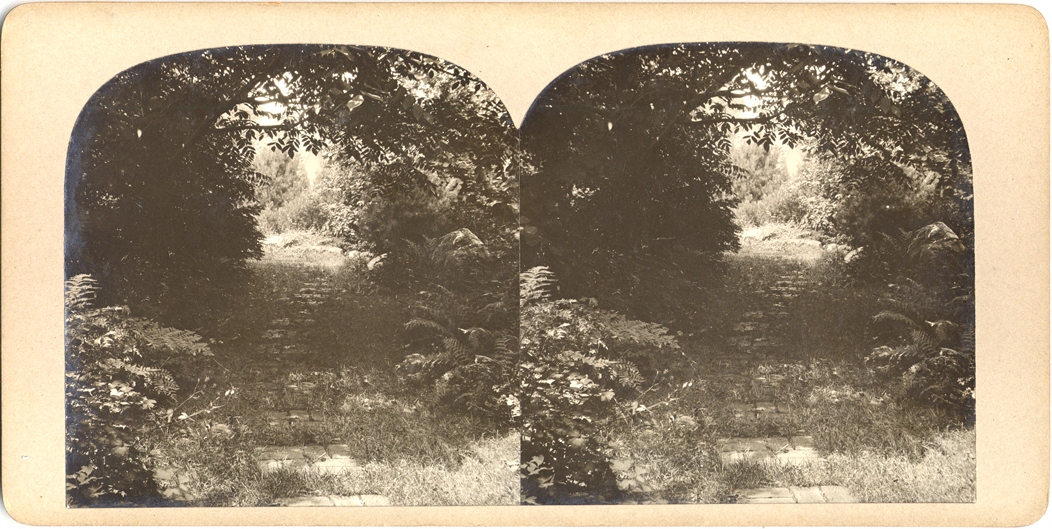 Gray mount. Dome topped. View down garden walk with trees and bushes on either side.