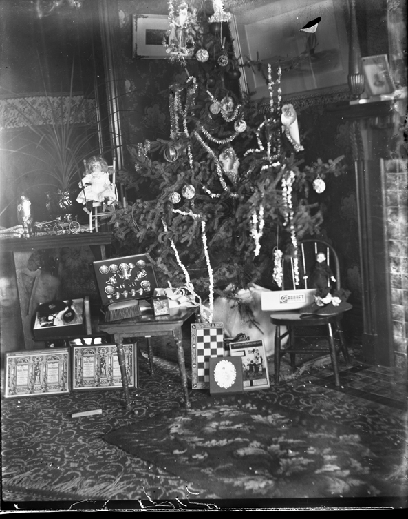 View of decorated Christmas tree next to fireplace; toys displayed in front of tree; dolls, tea set, miniature fire engine and games. Recorded in glass negative ledger: "D/Interior decoration."