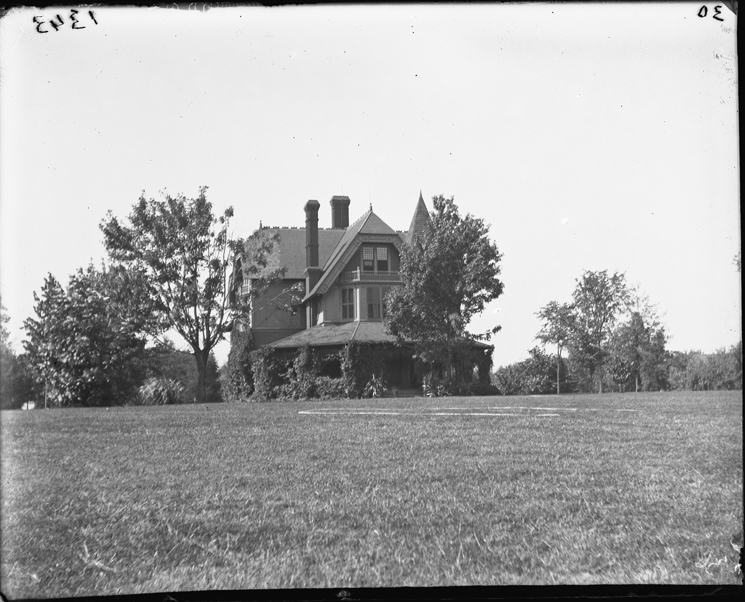 View of a three story Shingle style house in Grosse Pointe, Michigan, with a view of the grounds. Recorded in glass negative ledger: "M/Localities-Grosse Pointe-Historic houses."