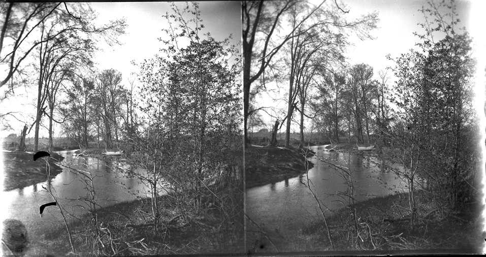 View of Rouge River; trees on banks. Recorded in glass negative ledger: "M/Localities-Sand Hill, view on the Rouge, 1900."