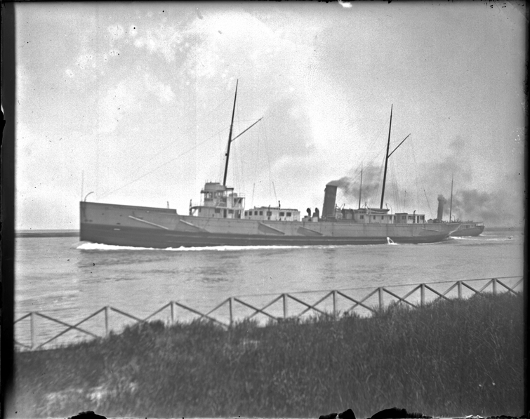 View of freighter travelling on Saint Clair flats; tugboat; fence along bank. Recorded in glass negative ledger: "M/Great Lakes-Boats & boating, freight steamer, St. Clair flats."