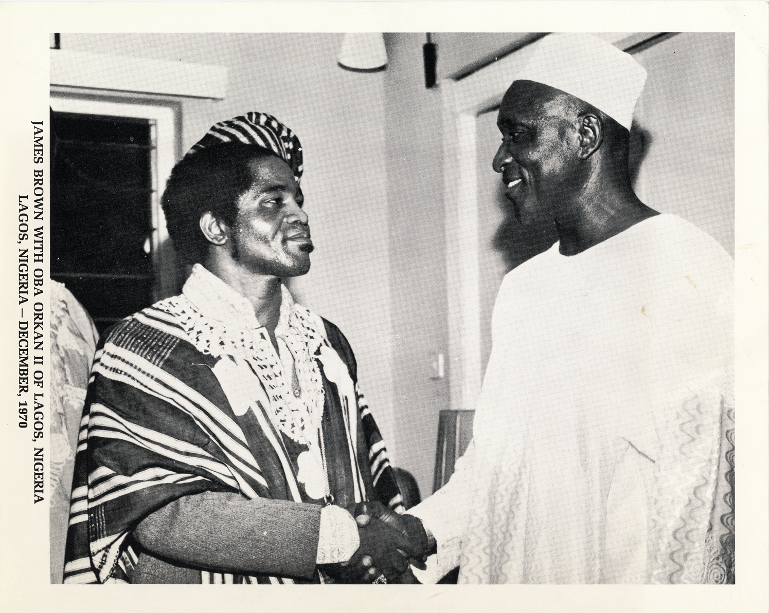 View of James Brown shaking hands with Oba Orkan II of Lagos, Nigeria. Printed on front: "James Brown with Oba Orkan II of Lagos, Nigeria. Lagos, Nigeria, December, 1970."