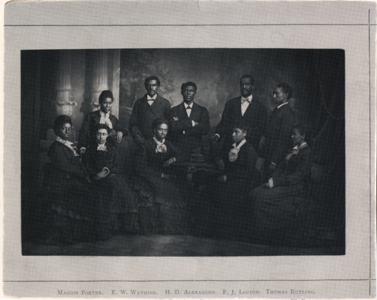 Group portrait of Fisk Jubilee Singers. Printed on front: "Maggie Porter, E.W. Watkins, H.D. Alexander, F.J. Loudin, Thomas Rutling."